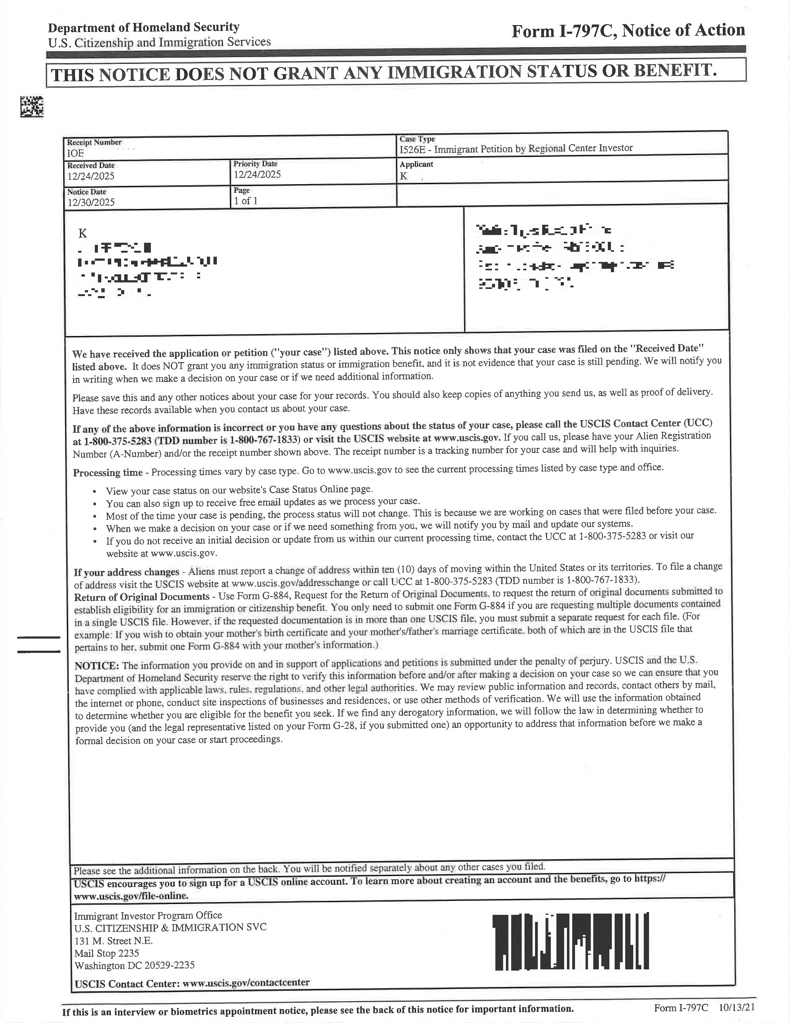 [미국] K**님의 I-526E가 성공적으로 접수되었습니다.